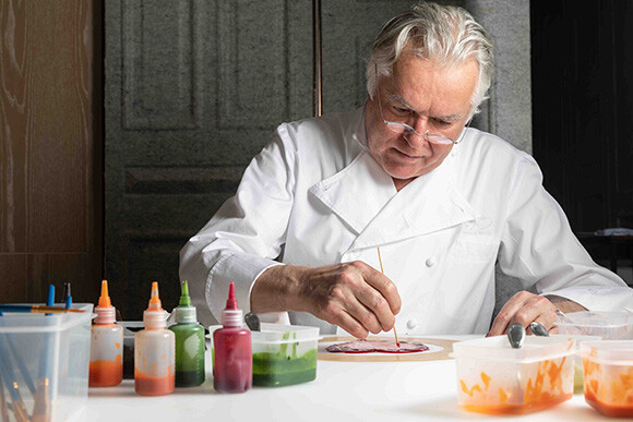 フランスのポワトゥー・シャラント地方出身、シェフのドミニク・ブシェ。お皿をキャンバスに、アートなガストロノミー料理を生み出す。