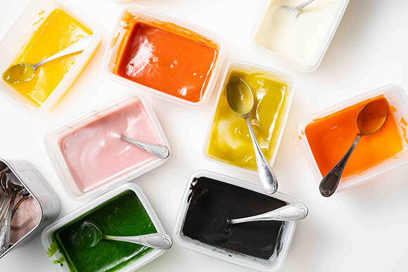 ドミニクシェフは、さまざまな食材を色鮮やかなピュレに。