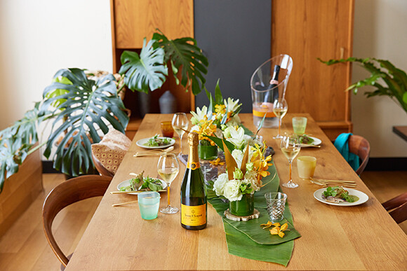 このワクワクするようなケータリングサービスの監修を務めるのは、世界各国のガストロノミーやデザインの領域で活躍する次世代のクリエイターとタッグを組み、食の未来を描くコミュニティプロジェクト「ヴーヴ・クリコ ザ・ニューメーカーズ コレクティブ」に参画する森枝幹と西恭平のふたり。日本のガストロノミー界でも注目の彼らが、魅力的なスペシャルメニューを監修する。さらに、どんなインテリアにもマッチする現代的な器や、テーブルに華やかさを添える「福千代(しろちよ)」によるフラワーアレンジメント、ヴーヴ・クリコ オリジナルのシャンパーニュグラスやアイスバケツなど、ラグジュアリーな時間を演出するコンテンツが満載。これからのパーティシーズンや記念日に、家族や親しいひとたちと過ごすおうち時間をヴーヴ・クリコのケータリングで、スペシャルなものにしてみては?