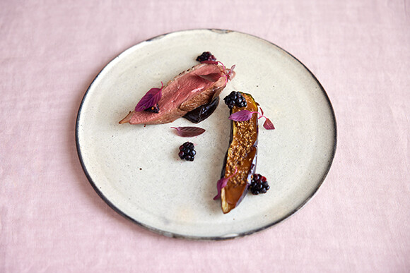 西恭平シェフ監修のコースメニューより。肉料理「フランス産鴨胸肉のロースト 黒ニンニクとブラックベリーのコンディマン」。