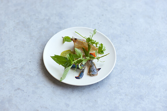 森枝幹シェフ監修のコースメニューより。冷菜「ワタリガニのトロピカルマリネ ミントのソース」。
