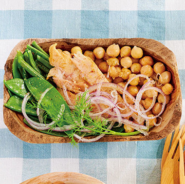 3. うつわにヒヨコマメ、サヤインゲン、サヤエンドウを盛り、ツナをのせ、赤玉ネギの薄切り、ディルを飾る。