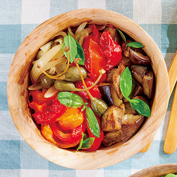 1. ナスは1cmの輪切りにして油を塗り、グリルパンで焼き色がつくまで焼く。パプリカ、半割りにしたトマト、玉ネギを200℃のオーブンで20分焼く。パプリカは皮をむき、それぞれ食べやすい大きさに切る。