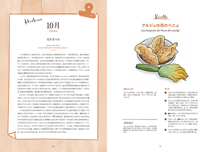 10月のテーマは「花を食べる」。和食でも昔から花を使った料理が存在することにも触れながら、クルジュ(ズッキーニ)の花のべニェなどが紹介されている。写真の代わりに色鮮やかなイラストが添えられている点にも想像力をかき立てられる。