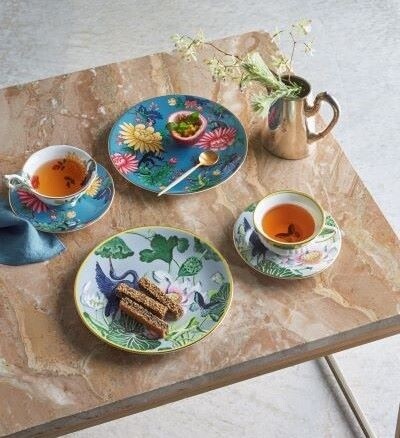 色使いや絵柄のあしらいも大胆でコンテンポラリー。花を贈るような気分でプレゼントしたい「ワンダーラスト」コレクション。左上:「ワンダーラスト サファイアガーデン」ティーカップ&ソーサー¥8,250 上:プレート(φ20cm)¥4,400 右:「ワンダーラスト ウォーターリリー」ティーカップ&ソーサー¥8,250 下:プレート(φ20cm)¥4,400 photography:  Teruaki Kawakami (bean) styling: Yuko Magata