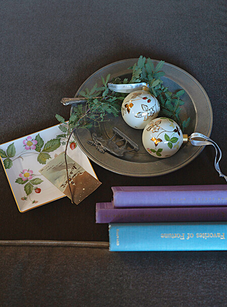 「繊細な陶器のオーナメントは、吊り下げるだけではなく、プレートやトレイに置いて飾ることができます。その時にはぜひ、クッション材替わりになるポストカードやリボン、葉などをあしらって。また、ドライになってもいいような植物とオーナメントをガラスの瓶に入れる飾り方もいいですね」(作原)