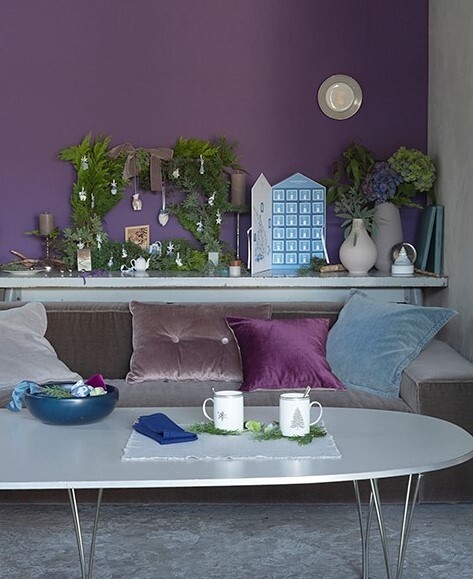 「オーナメントを飾ったリースは、額縁にさまざまなグリーンを巻き付けただけで、手軽に作ったお手製のもの。枝ぶりがしっかりした葉を選んで、フレームに紐やワイヤーを使って自由に巻き付けていくだけで完成です。ユーカリや紫陽花など、ドライで楽しめる植物を組み合わせるのもおすすめです。中央のリボンを使って壁に掛けてもいいけど、壁に立て掛けるだけでも。ウェッジウッドらしい、ポーセリンのオーナメントやアドベントカレンダーのライトブルーが映えるよう、可愛くなりがちなパステル色を避けて、紫や青などワントーン下げた濃い重ための色を意識的に取り入れることで、全体のコーディネートが大人っぽく仕上がります」(作原)