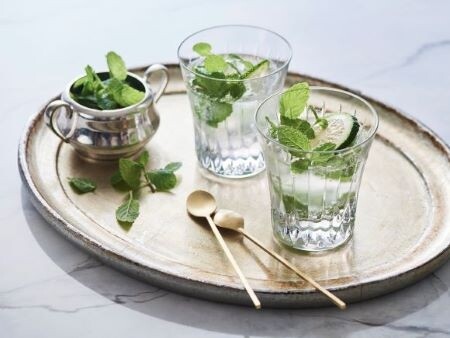 上質なクリスタルのグラスはお酒だけでなく、フレッシュなハーブウォーターなど、朝の始まりの一杯におすすめ。「アニュアルタンブラー 2022 アース」(H9.5cm、250ml)各¥5,500/ウェッジウッド photography:  Teruaki Kawakami (bean) styling: Yuko Magata