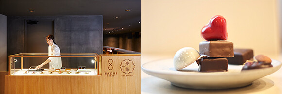 ショコラティエの副島圭美(左写真)が掲げるコンセプトは、ブランド名の由来にもなっている無限大∞の可能性。イチ推しは佐賀県神埼市のいちご農家・香月農園によるさがほのかのピューレを贅沢に使用したボンボンショコラ(右写真上)で、一粒330円。写真提供: 和多屋別荘