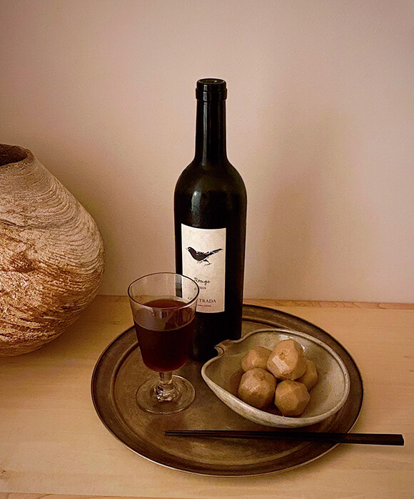 「仕事をしてから前よりも選ぶことが増えた国産ワインですが、家では和食が8割という私にぴったりでした。岡山県産ブドウの軽やかなワインは、芋の煮転がしやきんぴらをつまみに。長くお仕事をさせてもらっている土井善晴先生のレシピです。アトラス・アンティークスで見つけたヴィンテージグラスが美しく寄り添ってくれます」