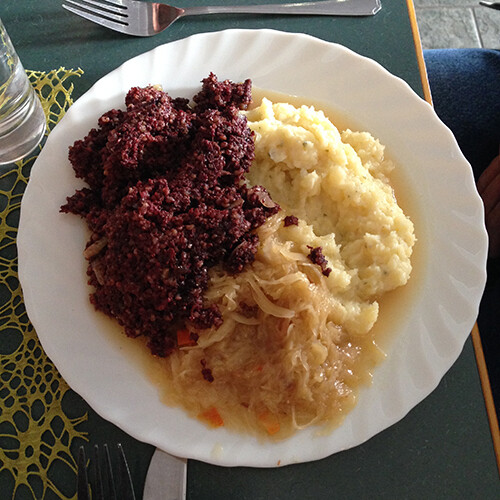 旧東ドイツの名物料理「死んだおばあちゃん」。ひきわりの大麦が入った血のソーセージを玉ねぎなどと炒めて、付け合わせのマッシュポテトやザワークラウトなどを混ぜながら食べる。