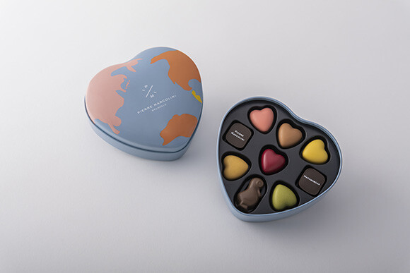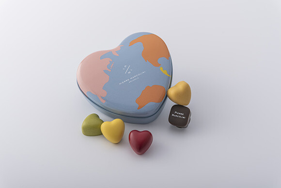 とくにおすすめは、ピエール マルコリーニのアイコン的存在であるハートモチーフのチョコレート「クール シリーズ」を堪能できる「コフレ クール」。今年のバレンタインのコンセプトロゴをかたどった、ハート型の地球儀を模した遊び心のある缶が、旅心をくすぐる。