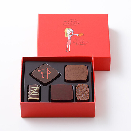 見てると食べてしまうから、隠しておいて!と言っているパリジェンヌがモチーフのイラストが愛らしい。新作「アンフィニマン クレマンティーヌ」が5個入りセットには入っている。「アソリュティマン ド ショコラ」(5個入り・限定ボックス)¥2,268