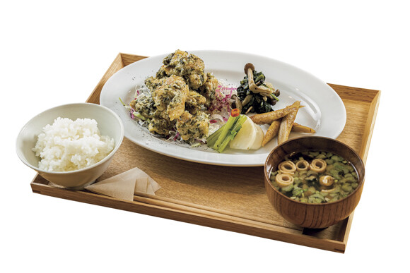 衣に茶葉が付いているうえに米粉を絡ませているので、繊維も取れてさっぱり食べられるお腹に優しいメニューです。シェフお得意の肉の火入れもちょうどいい。本当においしいの で、ランチに来るたびにリピートしてしまう。まるで森で食事しているような、郊外に食事に来ているような気分を渋谷で味わえます。¥950