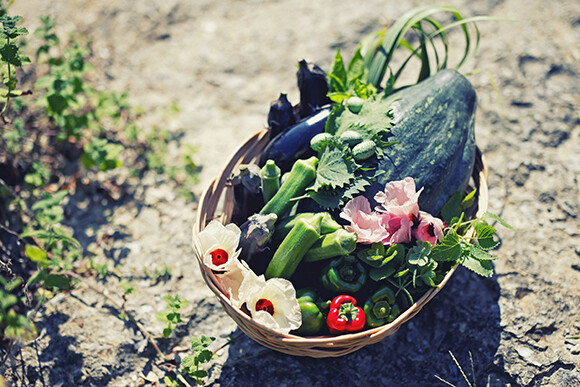 朝に収穫した新鮮な野菜を販売するマルシェ。