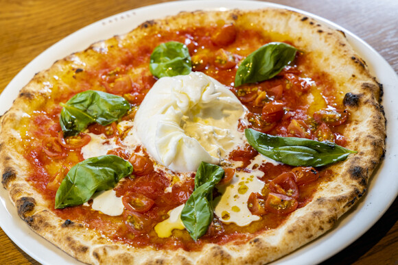 人気ナンバーワンのピッツァは、トマトソースと甘味のあるチェリートマト、群馬県川場産の新鮮なチーズをダイナミックに乗せた「ブッラータ」¥2,680