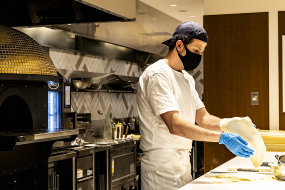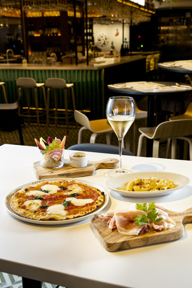 ピザ窯を構えるレストランでは、店内で作るピザ生地とパスタの料理を中心に、前菜やドルチェまで幅広く提供。