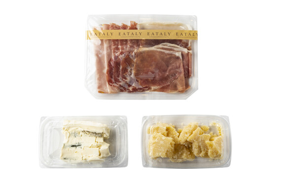 上: 盛り合わせパックも便利。「生ハムサラミ5種盛り合わせ」¥2,160 左:ゴルゴンゾーラとマスカルポーネをサンドした「トルタ・モンテビアンコ(100g)」¥1,072 右: 「パルミジャーノ・レッジャーノ(26カ月熟成)」¥1,360