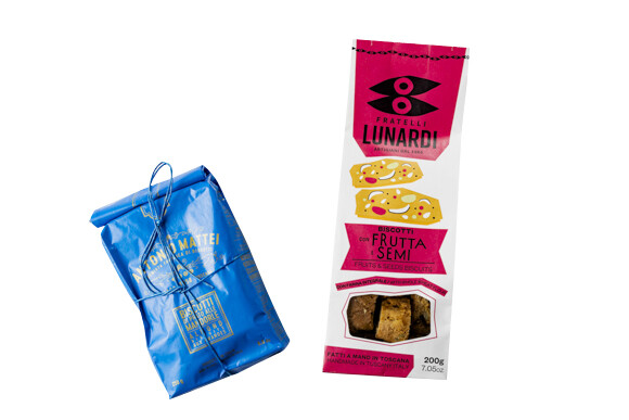 左:アーモンドを 使ったビスケット、カントチーニはパッケージも可愛い。ベーシックな老舗の味「アントニオ・ マッティ」¥1,728 右:多種類の味を揃える「ルナルディ フラテッリ」¥1,280