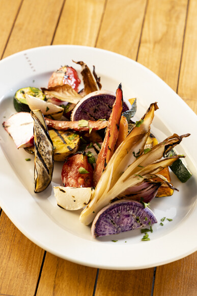 銀座の街を一望できるテラス席が人気のラ・グリーリアでは、本格的なグリル料理で素材そのものの味を楽しもう。厳選された肉、魚のほか、季節の野菜を直火で焼き上げるのは、オープンキッチンからのぞく幅3mの巨大なグリラー。シンプルで最も難しい直火という調理で供される味は感動もの。