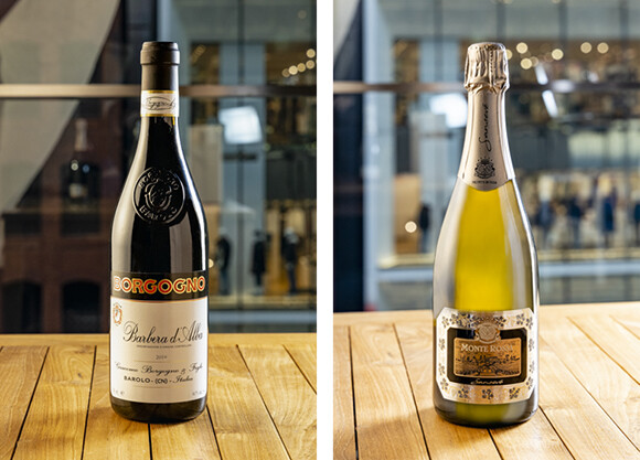 左:ピエモンテ州で古い歴史を誇るボルゴーニョの赤ワイン「バルベーラ・ダルバ」¥5,016 右:ギフトに最適なシャルドネ「モンテロッサ フランチャコルタ サテン ブリュット」¥6,105