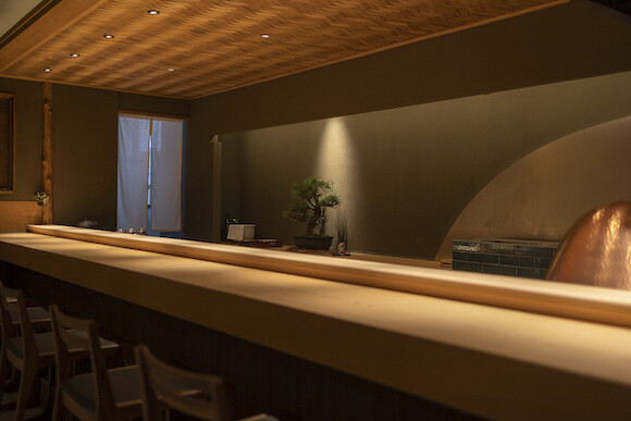 場所は高級絹織物の産地、西陣。空間の主役は祖父の店から受け継いだ長さ7m弱、厚さ14cmという立派なヒノキのカウンター。網代天井や名栗の扉といった数寄屋建築をモダンなデザインで仕上げている。