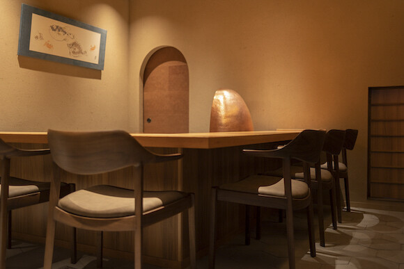 新しく造られたL字型のカウンター。欅のカウンター、清好堂中島にオーダーした柿渋の障子、むくませた六角形の特注タイルの床、西陣織の絵付師が手がけた原画の額装など、西岡のこだわりが詰まった空間。接待や家族での貸し切りにぴったり。