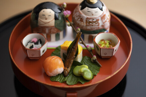 コースの始まりは季節感あふれる八寸から。ひな祭りの仕立てで、うるいと浜防風 さよりの昆布締め、菜種のお浸し、根芋の海苔和え、長芋の梅酢漬け、ビタミン大根とイクラ、菜種真丈、サーモンの手まり寿司、モロコの炊いたもの、一寸豆。器は祖父から受け継いだものが大半で、少しずつ自分でも買い足しているそう。