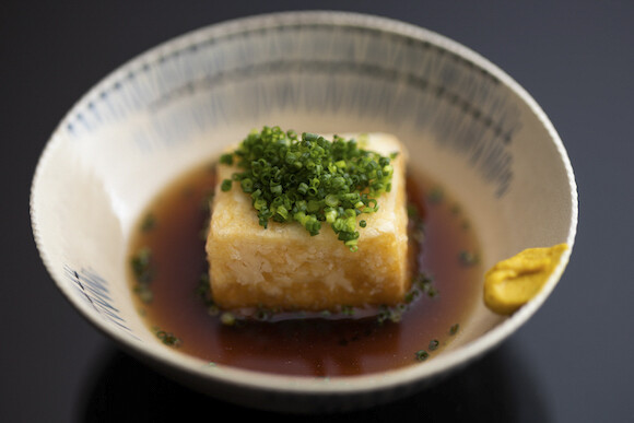 天ぷらの最後に出てくるのが、祖父が考案したという豆腐の天ぷら。いわゆる揚げ出し豆腐で、豆腐は北野天満宮前のとようけ屋 山本のもの。薄い衣の食感と豆腐のなめらかさ、濃い目に仕上げた出汁でしみじみおいしい。