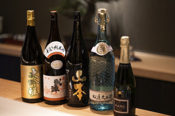 日本酒は酸味のあるものから甘みのあるものまで幅広くラインナップ。ワインにも力を入れ、左から、グラスで白4種、赤2種を揃える。日本酒1合¥880〜、シャンパンハーフボトル¥6,600〜