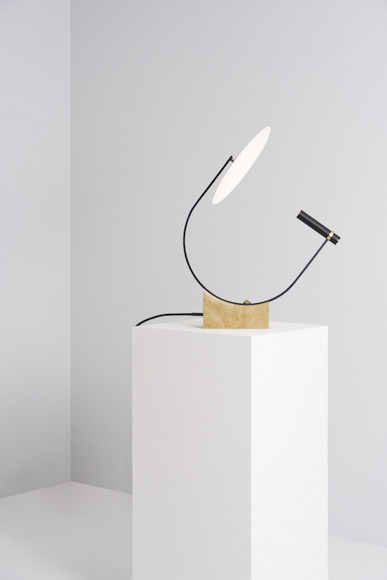 「SUKI」の名には、透き、漉き、隙、数寄など複数の意味が重ねられています。極薄の典具和紙と繊細なステンレス細線による構成で、紙をはる際には障子張りの手法を参考にしていたそう。風を受けて静かに、軽やかに、シェードが揺れる様子も実に詩的です。ほかに手がけているのは「PHASE」。ディスクを回転させることで生まれる月の満ち欠けのような光が、周囲を温かく包みます。