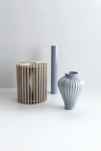 身の回りの素材にも目を向け、独自の制作プロセスで魅力的な品々を生み出している岩元航大さん。「PVC HANDBLOWING PROJECT」はホームセンターでも手に入る一般的な工業素材の塩ビ管を用いた花器。塩ビ管を熱で柔らかくしたうえで、昔ながらの型吹きガラスさながら空気を送り込む手法で形づくられます。