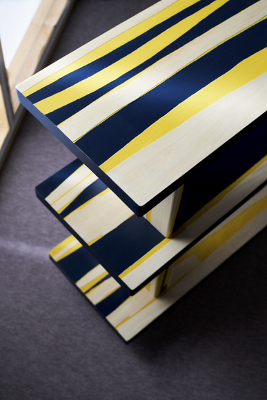 ほかに、着色した薄い木の板を積み重ね、表層をパリパリと剥ぎ取った木による家具「PARI PARI」も。「人の手で完全にコントロールすることのできないランダムなパターンは、偶然にもたらされる美です」と岩元さん。
