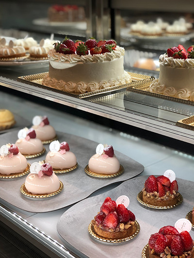 見た目も美しいアンリブレのケーキ。さくらのムース ¥605、苺のタルト ¥660 など。