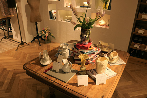 自室に豊かな彩りを添えてくれそうなデザイン性の高いヴィンテージの花器や器を眺めるだけでも楽しい。花器¥15,180 など。