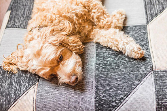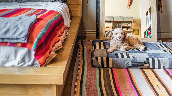 W.A.L.Dとのコラボ、「ReMadeベッド」で寝そべるデザイナーの愛犬。カバーとベッドのセット125ドル~、カバーのみ75ドル~/レイロウ photography: Bree McCool