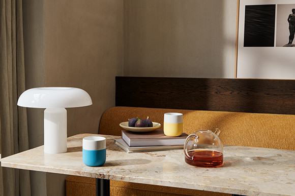 サンビームという名の春をいちばんに感じる温かな太陽の光と、カリビアンの名の清々しい青い空のカラーリングが、今季のフルーテッド コントラストから新登場。テーブルに季節感を運んでくれる。奥:カップ「フルーテッド コントラスト マグ サンビーム」 手前:カップ「フルーテッド コントラスト マグ カリビアン」(380ml )各¥3,850