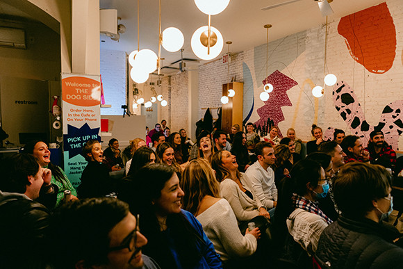 コメディショーは、イーストビレッジのドッグフレンドリーなカフェBoris and Hortonで開催。チケットは毎回ほとんど売り切れだという。photography: David Kirchner