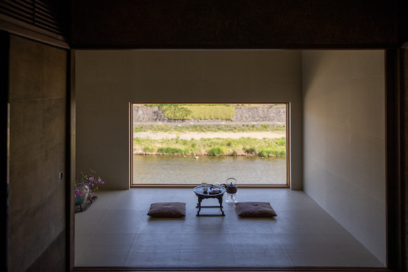 2階に上がると、鴨川の景色に思わず歓声が。ぐるりと部屋を取り囲むように貼られた和紙は黒谷の和紙職人ハタノワタルによるもの。小嶋が生ける季節の草花にも癒やされる。
