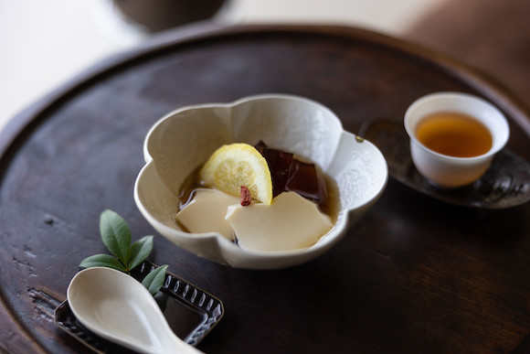 お菓子のひとつとして登場した自家製の台湾の豆花(とうふぁ)。ほかに自家製の黒胡麻ペーストが入った団子、湯圓(たんゆえん)や、ぜんざい、季節の水菓子など、時々で変わる。「茶席のコース」¥5,000