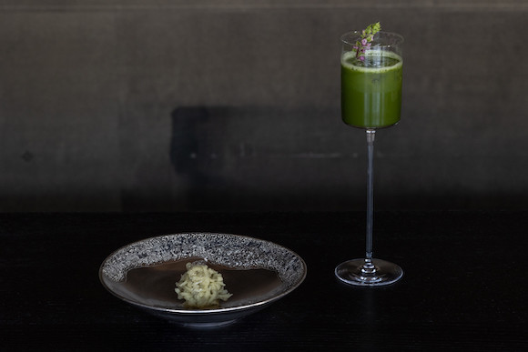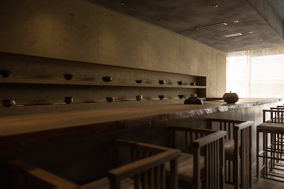 祇園南側の風情ある路地に佇むT.Tは、デザイナーであり現代美術家でもある髙橋大雅が手がける総合芸術空間。1階はタイガ・タカハシのコレクションや彫刻作品が並び、2階が月替わりの茶菓懐石を出す立礼式の茶室。かみ添に特注した手摺りの和紙や鉄媒染した杉のテーブルなど黒を貴重とした静謐な空間で供されるのは、和菓子職人による季節感あふれる5種の和菓子に、お茶やカクテルを合わせたペアリングコース。和菓子は甘さ控えめな中に、塩気や苦味を効かせたりとコース全体で五味を感じられる構成。そこに京都の生産者から仕入れたシングルオリジンのお茶や、旬の野菜やハーブのアクセントを加えたお茶ベースのカクテルが寄り添う。空間や設え、演出など隅々まで髙橋の美意識が満ち、五感で楽しめる場所となっている。