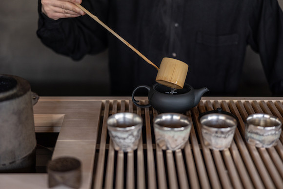 お茶を淹れるスタッフの所作も美しく、茶室を舞台にしたライブパフォーマンスを見るかのよう。銀彩の茶碗は福岡の日月窯の福村龍太の作。ここで使われる器やカトラリーなどはすべてオリジナルでオーダー。