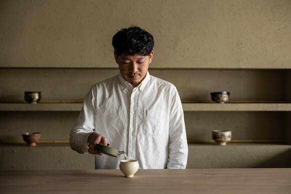 「日本の伝統を身近に」をコンセプトに掲げ、異業界から日本茶専門店を開業した店主の須藤。客のペースを見図りながら、釜から急須にお湯を注ぎ、お茶を煎れてくれる。1階では京都の宇治茶を中心とした質の高い日本茶や道具も販売する。