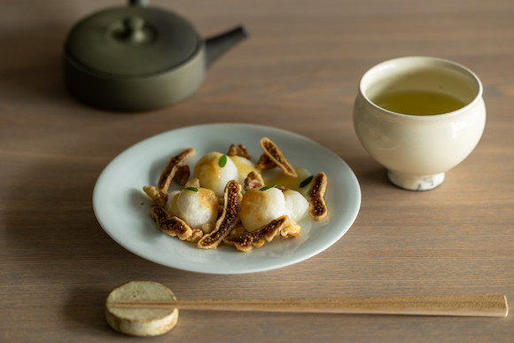つきたての餅に上品な甘さの白味噌だれ、無花果、胡桃、山椒という新鮮な組み合わせの「無花果と胡桃の炙り餅」に合わせたのは、京都・和束町産のかぶせ煎茶「さえみどり」。渋みがなく、濃厚な旨みと甘み、華やかな香りを楽しめる。セットで¥1,900