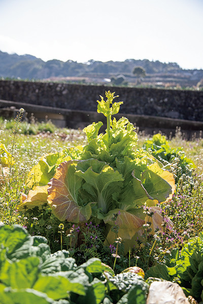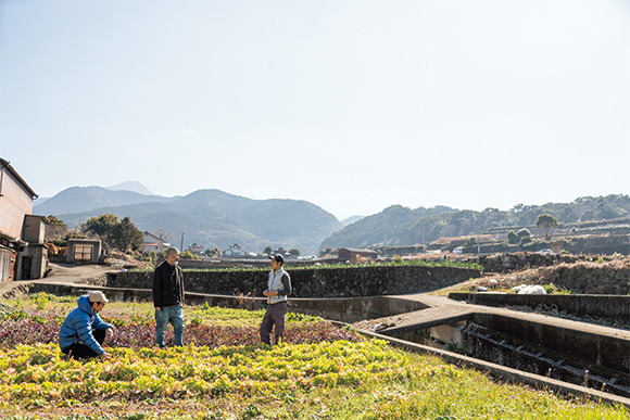 そんなタネ採り農家にも、いま、次の担い手が現れている。田中遼平はフィリピン留学時に自家採種栽培を知り、岩崎のもとで修業を積んだ。田中の畑はタネトから車で5分、海と山に挟まれたなだらかな丘陵地帯にある。一見普通の段々畑だが、野菜の実だけでなく、花が咲き乱れているのが印象的だ。たとえばハクサイは量産のために巻型が一般的だが、在来種の花芯白菜は黄色い花が咲き、花を囲むように葉が根元から広がる。「芯に陽が当たることで、芯も葉も柔らかく育つ」と、田中は言う。在来種野菜を守ることは、野菜の花が咲くこの原風景を守ることでもある。「タネを植えて実になって、花が咲いてタネを採る。その循環の中にある全体性やこの景色を繋いでいきたい」と、奥津。原川が雲仙に店を構えたことで、在来種野菜を味わえる場もできたいま、次世代に繋げていく準備が整った。3人は畑の葉をちぎっては口に運び、味を確かめながら畑を進んでいく。雲仙の麓で受け継がれていくタネの物語を知って、この地に根ざした野菜の味わいを噛み締めたい。
