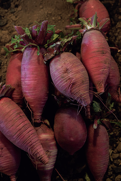 岩崎は40年間ひとりでタネを採り続けてきた、タネ採り農家のパイオニアだ。雲仙こぶ高菜、雲仙赤紫大根、長崎唐人菜、長崎赤カブ、黒田五寸人参……雲仙由来をはじめ、岩崎が育てる在来種野菜は約80種にも及ぶ。滴るようなみずみずしさと優しい甘味、旨味が凝縮された野菜は、昨今なかなか味わえないような懐かしい味。自家採種栽培とは、農薬や化学肥料を使わず、タネが交雑しないように計算しながら栽培するということだ。いまの農家の多くはタネを買って野菜を栽培するが、昔は普通に行われていた方法で、とてつもなく手間暇がかかる。奥津いわく、それは「アスリートの所業」だ。
