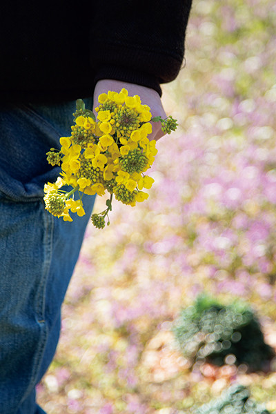 原川は畑を歩きながら花芯白菜を口に運び、黄色い花を摘んで持ち帰る。