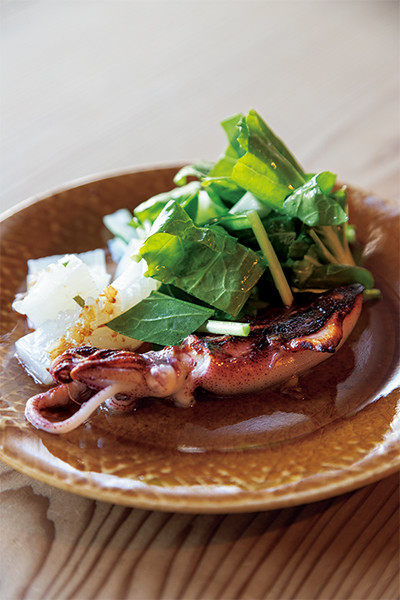 すべておまかせコース(¥9,000)から、「壬生菜、杓子菜、小ヤリイカ」。ミズイカと小ヤリイカの火入れが絶妙で、口の中でやわらかく溶ける。壬生菜と杓子菜、2種の青菜の味の違いも楽しい。