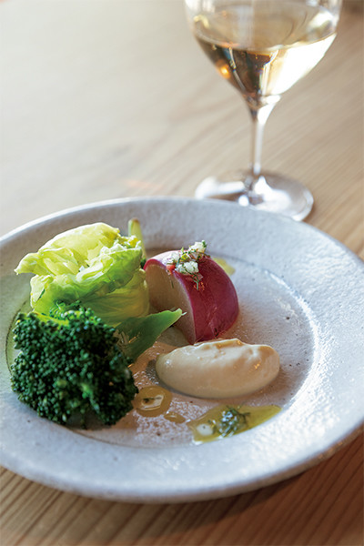 「万木赤かぶ、花芯白菜、ブロッコリー」。温泉水で蒸して旨味を凝縮。果実のようにフレッシュな赤かぶ、芯まで柔らかい白菜、青味の強いブロッコリーに、マスタードと塩漬けレモンの豆腐ピューレを添えて。ペアリングにはフランス産白ワイン「ラ ヴィ オン ニ エ 2020」を。