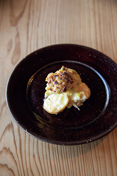 「カリフラワー、ニシユタカ」。長崎名産ジャガイモと岩崎が育てたカリフラワーをグラタンに。ほどよい塩気とホロホロの食感がクセになる。